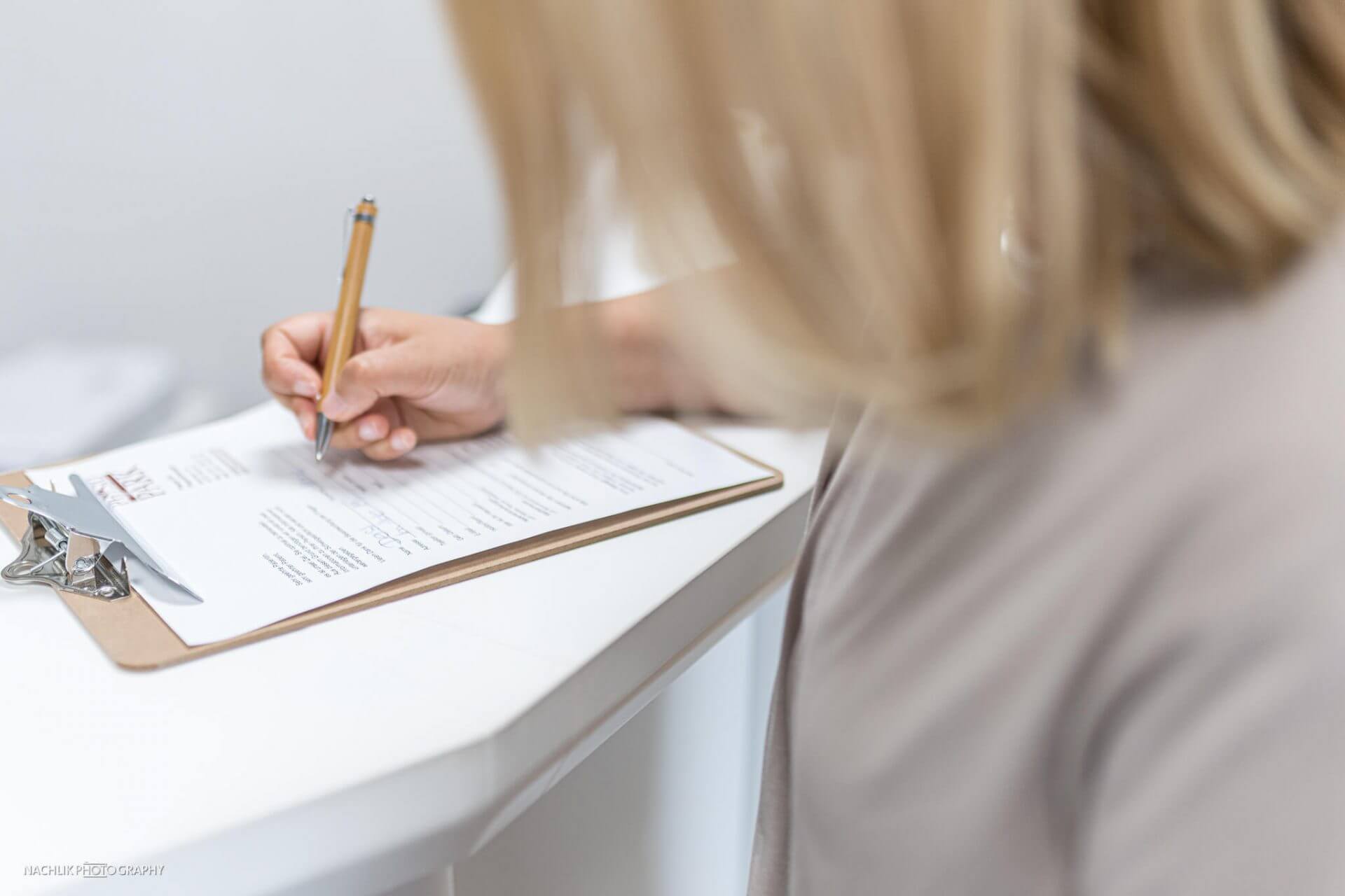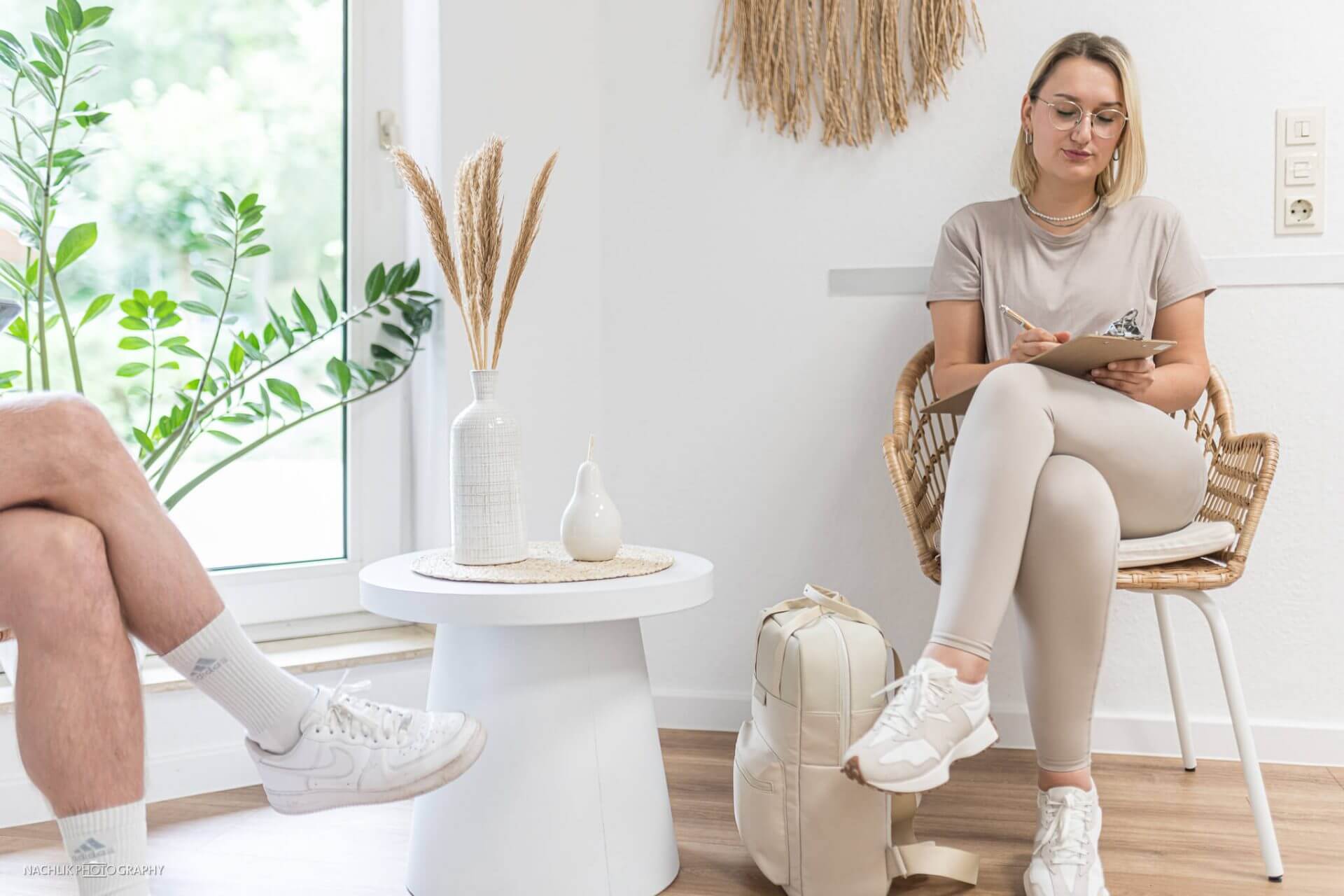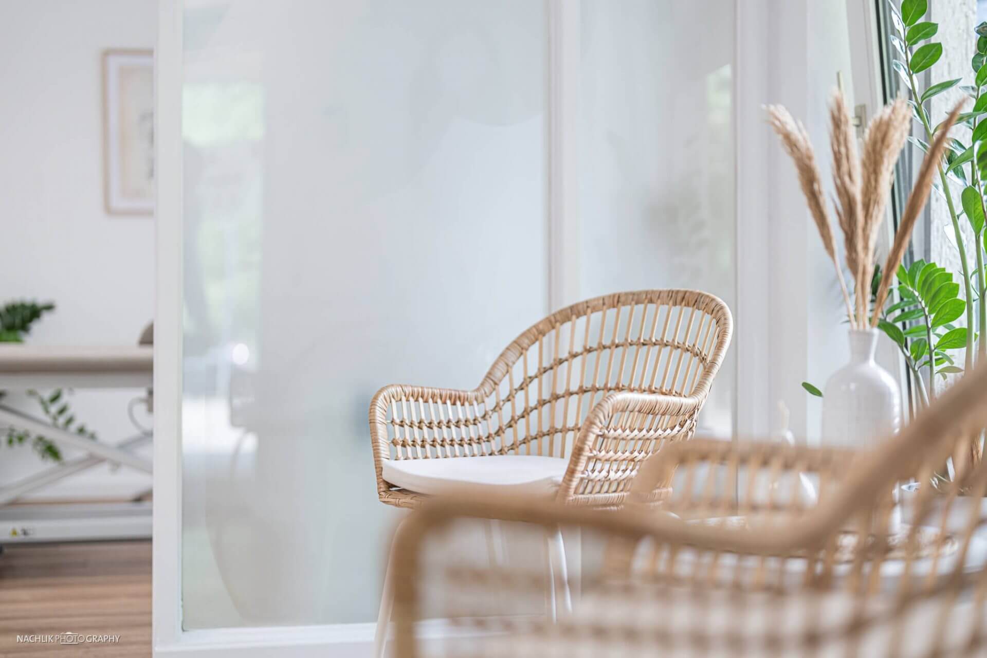 Das können dekorative Gegenstände, eine abgestimmte Farbfläche oder ein Blick auf bereitgestellte Behandlungsgeräte sein.