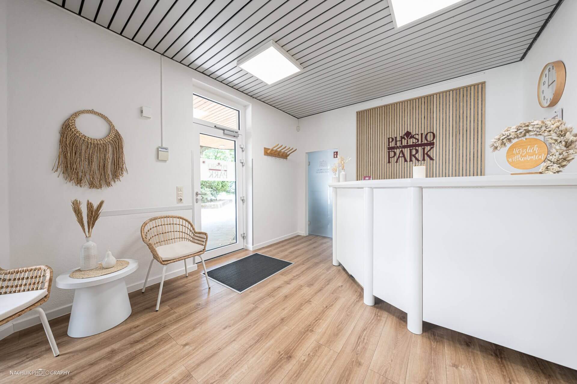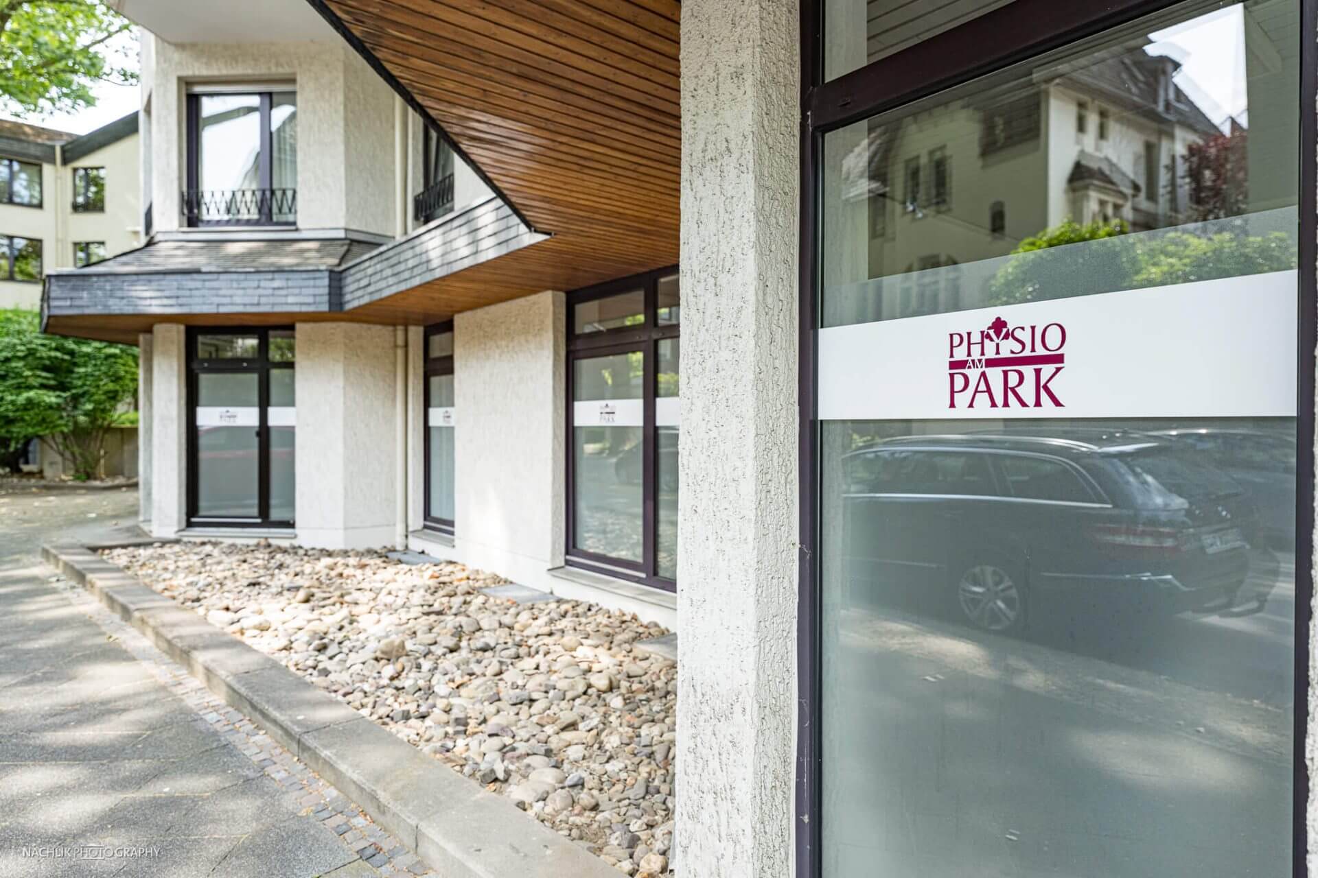 Der Standort von Physio am Park Bochum wurde innen und außen fotografiert. Die Außenaufnahmen zeigen Eingangsbereich und Fassade in klarer, einladender Darstellung.